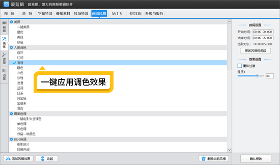 色调的统一是提升视频整体美感的关键。在剪辑过程中,可以通过调整不同片段的色调、亮度、对比度等参数,使它们之间的色彩更加协调一致。这样不仅可以增强视频的视觉冲击力,还可以让观众在观看过程中更加舒适。我们可以点击“画面风格”左栏的“美化”,可以给视频一键应用符合主题的色调。