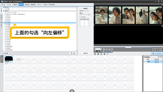 随后,将视线移至软件左侧的“叠加素材”区域,点击展开后找到“加贴图”这一功能入口,把事先精心拼接好的两张洋溢着幸福甜蜜气息的婚纱照片导入到视频当中。把它们分别巧妙地摆放在上方和下方的位置,对于上面的婚纱照片勾选“向左偏移”,下面的婚纱照片则勾选“向右偏移”,且都设置持续时长为10秒。通过这样的设置,照片就会呈现出如同胶片一样优雅移动的效果,赋予视频一种复古而时尚的动态美感,仿佛带着观众穿越时光,重温新人拍摄婚纱照时的美好时刻。