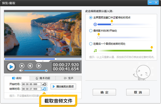 修改截取视频时间段方法一:在“视频”面板的“已添加片段”中双击要修改的视频片段,会弹出“预览/截取”对话框,我们可以对要截取的视频时间段进行修改。图1:双击视频片段缩略图图2:修改截取视频时间段方法二...