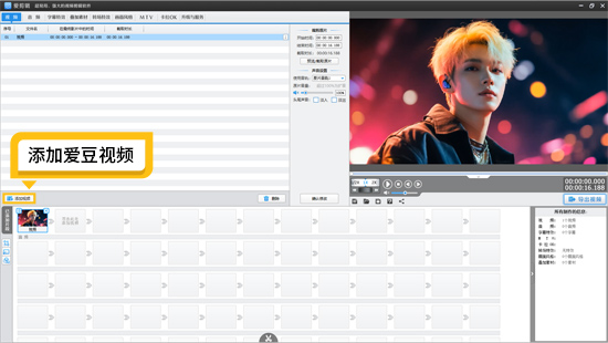 完成尺寸设置后,来到爱剪辑的主操作区域。在界面上找到“添加视频”按钮,导入视频。从你的文件存储路径中挑选精心收集的爱豆视频素材。