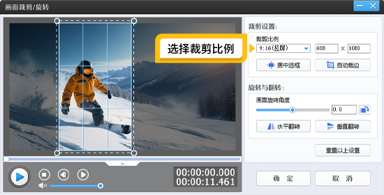 如果需要特定比例(如竖屏9:16),可以直接选择裁剪比例,软件会自动调整画面。