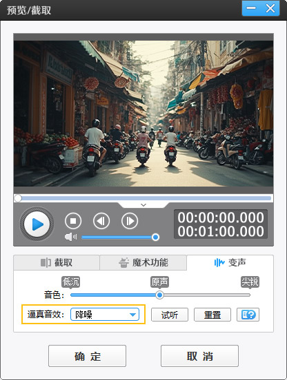 确保旁白或对话清晰可闻,必要时使用降噪工具。如果需要降噪处理,那可以右键要处理文件,选择“变声/逼真音效”,在下拉框选择“降噪”即可。